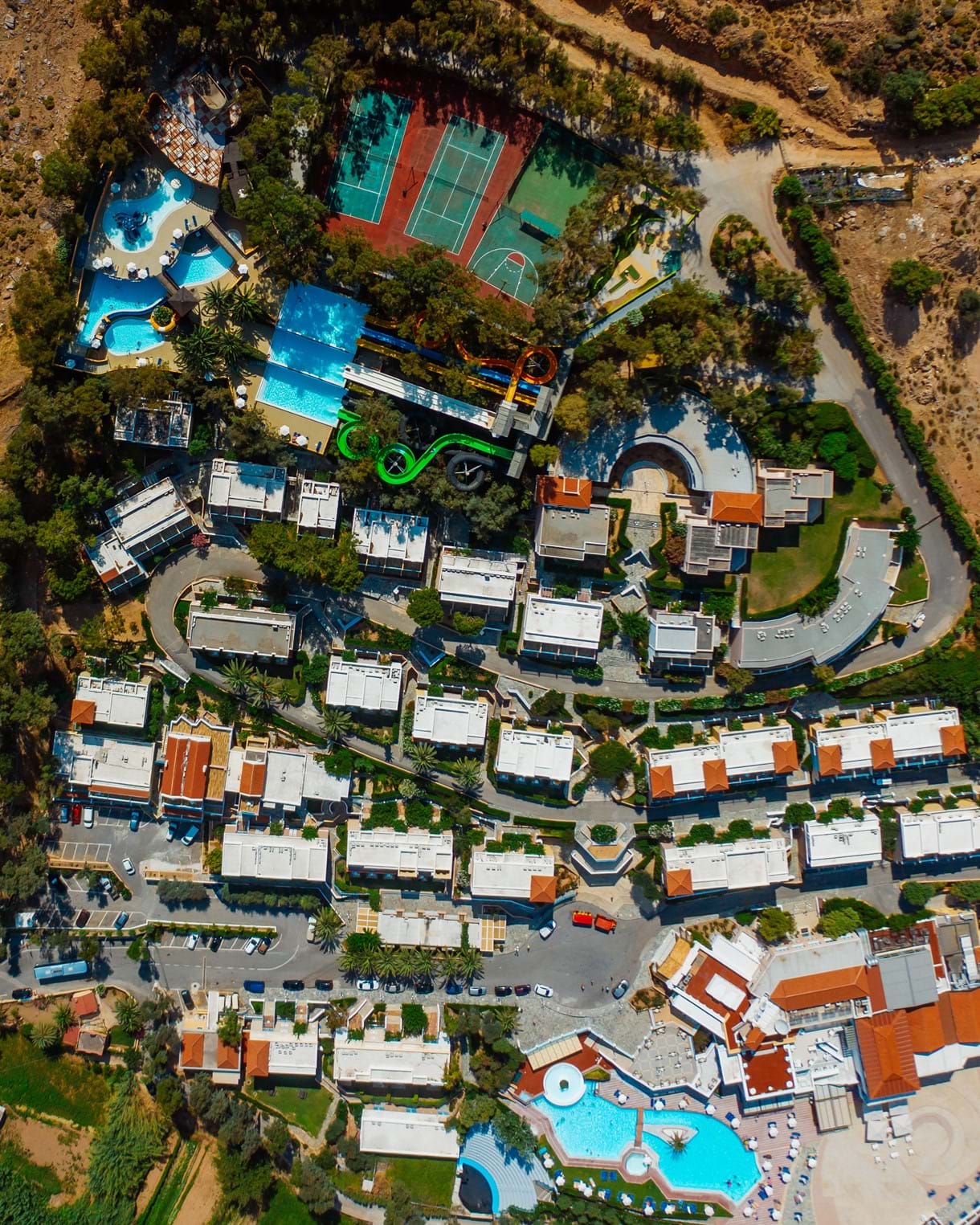 Fodele Resort Hotel Aquapark is the first international project designed by Tülay Tosun. Located in the Fodele region near Heraklion, the project sits on a steep 60% slope and expands the existing resort with a 5,000 m² aqua park developed at the uppermost level of the property. The family-owned Fodele Resort Hotel, managed by the founding and second-generation members of the Giannikakis family, forms the emotional foundation of this collaboration, built on trust and friendship.