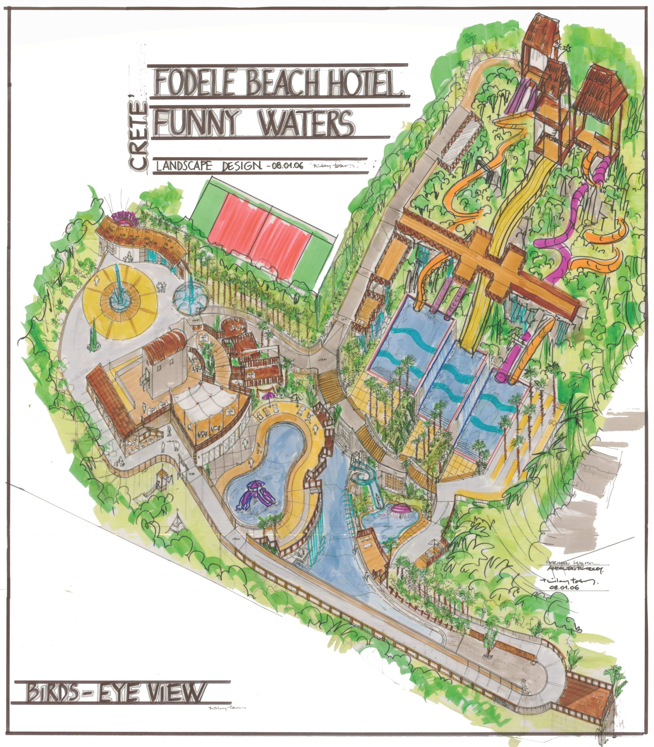 Fodele Resort Hotel Aquapark, Tülay Tosun’un yurt dışında gerçekleştirdiği ilk projedir. Heraklion yakınlarındaki Fodele bölgesinde, %60 eğime sahip zorlu bir arazide konumlanan proje, mevcut tesisin en üst kotunda 5.000 m²’lik yeni bir aqua park alanını kapsar. Aile işletmesi olan Fodele Resort Hotel, kurucu kuşakla birlikte ikinci kuşak Giannikakis ailesi tarafından yönetilmektedir. Kuşaklar arası bu süreklilik ve güven ilişkisi, projenin duygusal temelini oluşturmuştur.