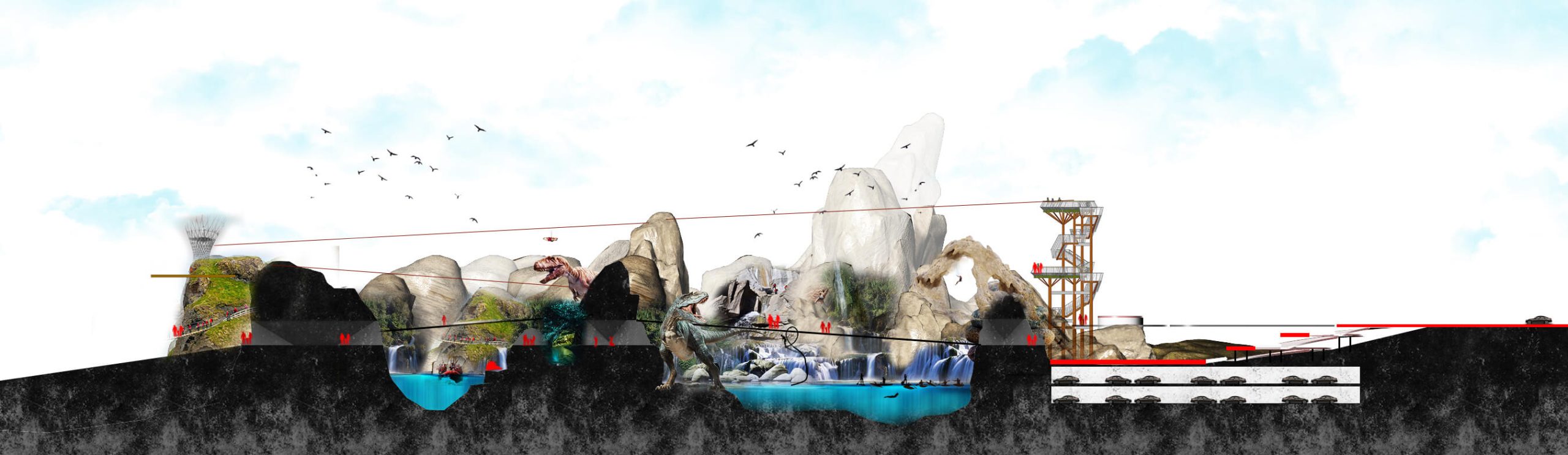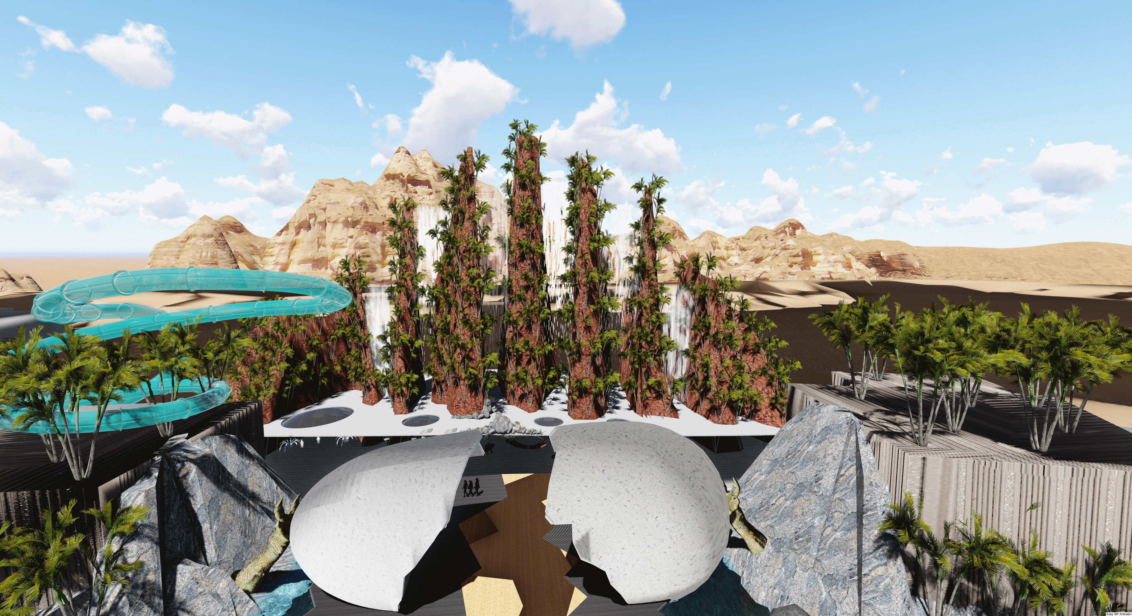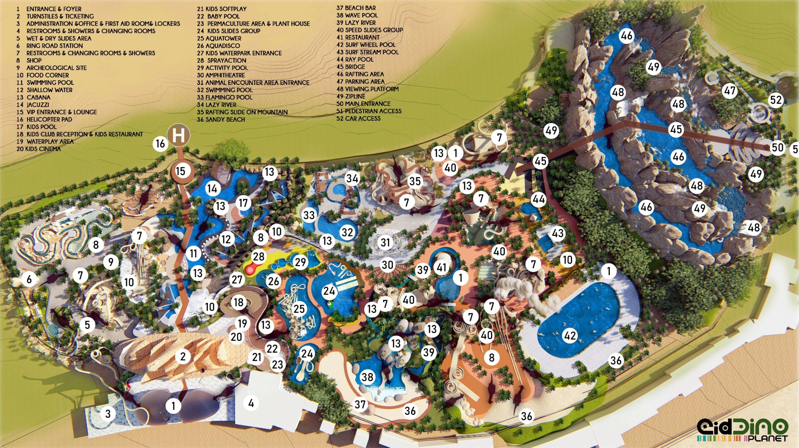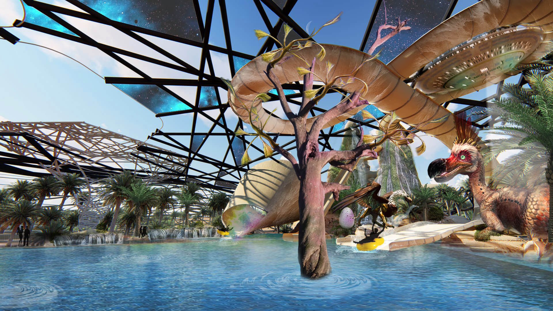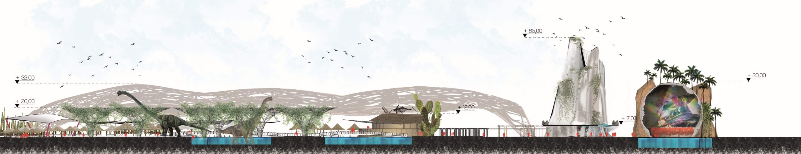 Qiddiya Waterpark is a themed waterpark project completed in Saudi Arabia. The design features various entertainment zones and water-interactive themed areas tailored to different user groups. Within the scope of the concept waterpark works, a variety of functions such as water slides, wave pools, lazy rivers, kids’ play zones, and relaxation areas were integrated into a comprehensive layout.